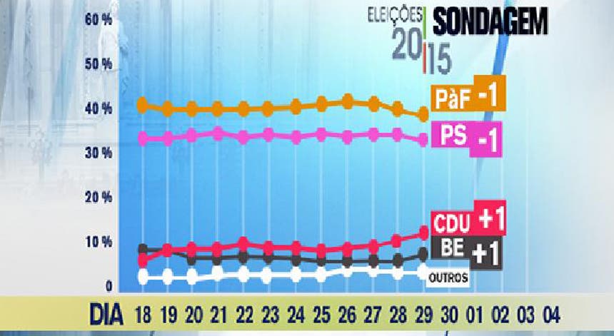 Ficha técnica: Esta sondagem foi realizada pelo CESOP – Universidade Católica Portuguesa para a RTP entre os dias 25 e 28 de setembro de 2015. O Universo alvo é composto pelos indivíduos com 18 ou mais anos recenseados eleitoralmente residentes em Portugal Continental em lares com telefones fixos. Foram obtidos 1010 inquéritos válidos, sendo 58% dos inquiridos mulheres, 29% da região Norte, 29% do Centro, 37% de Lisboa, 2% do Alentejo e 4% do Algarve. Todos os resultados obtidos foram depois ponderados de acordo com a distribuição de eleitores residentes no Continente por sexo, escalões etários e região na base dos dados do recenseamento eleitoral e do Censos 2011. A taxa de resposta foi de 59%*. A margem de erro máximo associado a uma amostra aleatória de 1010 inquiridos é de 3,1%, com um nível de confiança de 95%. * A taxa de resposta é estimada dividindo o número de inquéritos realizados pela soma das seguintes situações: inquéritos realizados, inquéritos incompletos e recusas.