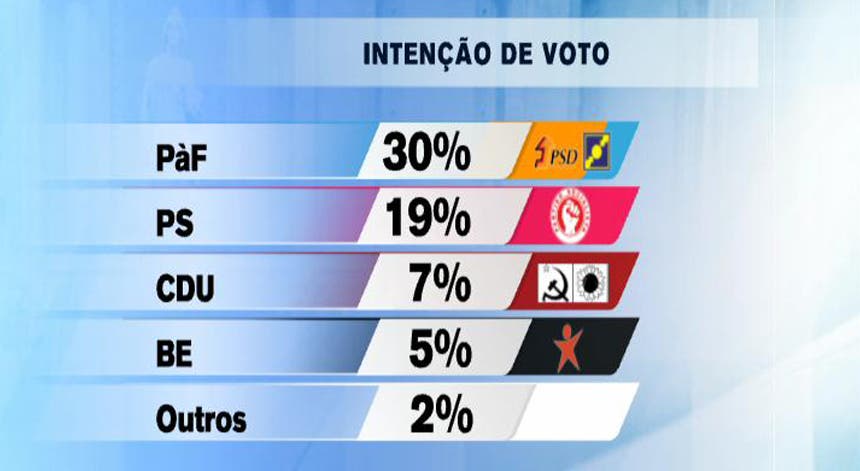 Neste capítulo, de registar a forte descida de dois pontos percentuais da PàF, que se fica esta terça-feira pelos 30%, face aos 32% da véspera. PS (19), CDU (7) e BE (5) mantêm os valores de segunda-feira para a intenção directa de voto.