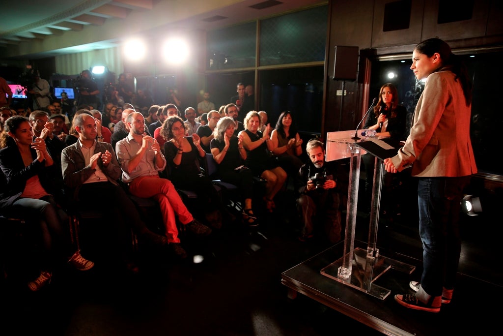 20h09 - Na sede de campanha do Bloco, Mariana Mortágua, entre muitos aplausos, afirmou que, caso se confirmem as projeções, o seu partido terá a maior representação parlamentar de sempre. Foto: Lusa/Tiago Petinga
