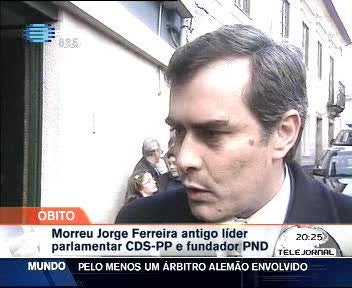 Jorge Ferreira, antigo líder parlamentar do CDS-PP e fundador do PND, faleceu esta manhã, aos 48 anos, vítima de doença prolongada. Manuel Monteiro lamentou a morte daquele que foi sempre o seu braço direito, o amigo "autêntico, verdadeiro, leal e combativo".