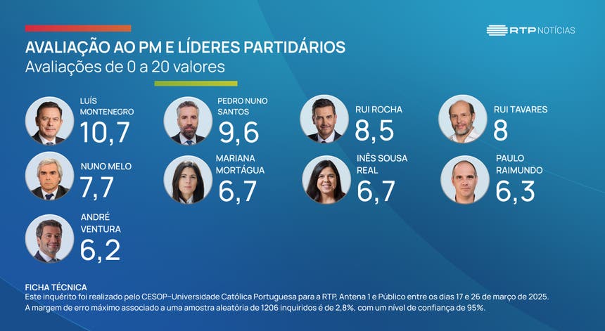 A avaliação média de Pedro Nuno Santos (PS) foi de 9,6, seguindo-se Rui Rocha (IL) com 8,5; Rui Tavares (Livre) com 8; Nuno Melo (CDS-PP) com 7,7; Mariana Mortágua (BE) e Inês Sousa Real (PAN) empatadas com 6,7 e Paulo Raimundo (CDU) com 6,3.
