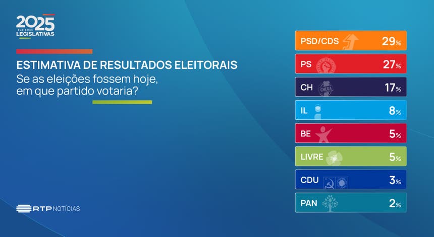 A sondagem do CESOP - Universidade Católica Portuguesa para a RTP, Antena 1 e Público, conhecida esta quarta-feira, revela um empate técnico entre AD e PS nas eleições legislativas de 18 de maio, apesar de o partido de Luís Montenegro apresentar uma ligeira vantagem. Prevê-se também que os três principais partidos tenham uma redução nos votos, enquanto IL, BE e Livre revelam um crescimento palpável.