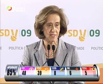 A líder do PSD agradeceu aos militantes o apoio dado durante a campanha eleitoral e afirmou que já saudou José Sócrates pela vitória. Manuela Ferreira Leite afirma que o PSD fará uma "Oposição responsável" e recordou que os portugueses tiraram a maioria absoluta ao PS.