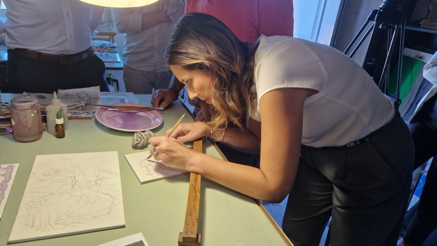 “Agora vai decalcar para o azulejo”, desafiou Bráulio Figo. Estendeu-se um pincel. “ Ai, isto para os canhotos é mais difícil”, sorriu a líder da Iniciativa Liberal.