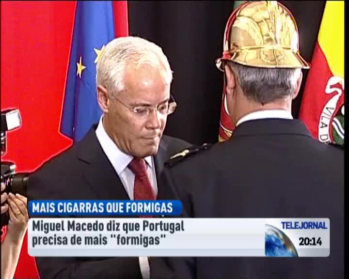 O Ministro da Administração Interna diz que Portugal não deve ser um país de muitas cigarras e de poucas formigas. Declarações de Miguel Macedo ao inaugurar um quartel de bombeiros onde tinha a espera um grupo de manifestantes. As vaias e apupos levaram-no a deixar a inauguração incompleta.