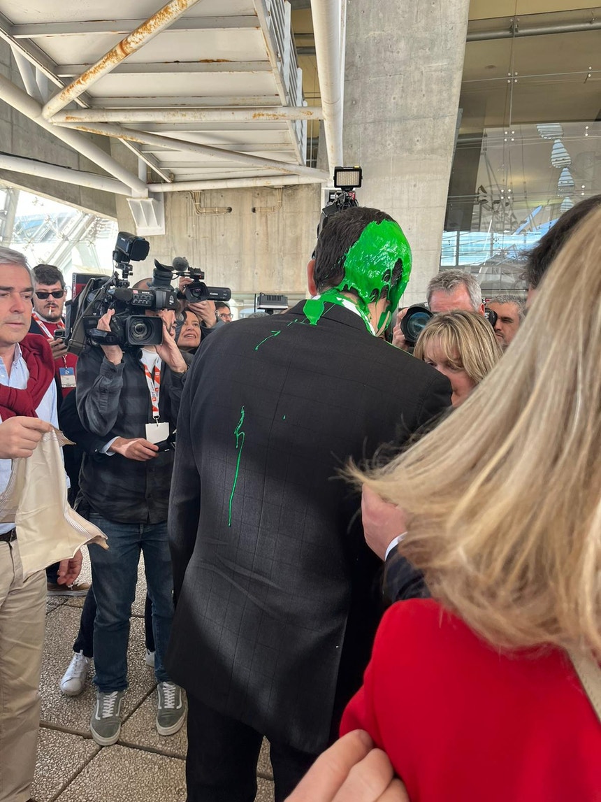 Luís Montenegro foi esta manhã atingido por um balde de tinta verde atirado por um ativista climático. O ataque foi, entretanto, reivindicado pelo movimento climático "Fim ao Fóssil".