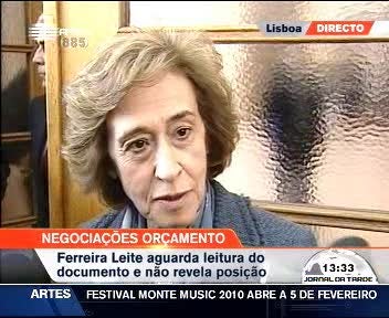 O CDS-PP vai viabilizar o Orçamento do Estado para 2010 com uma "abstenção construtiva". O voto positivo não foi atingido devido a desacordo em três pontos que Paulo Portas considera fundamentais. O PSD ainda não esclareceu como vai votar o Orçamento mas após nova reunião com o Governo Manuela Ferreira Leite disse que saiu com "bastante boas indicações".