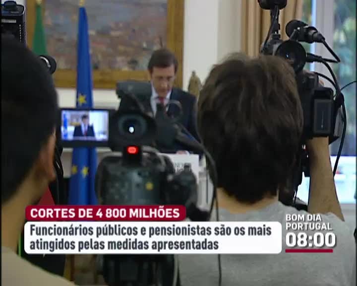 Funcionários públicos e pensionistas são os principais alvos do Governo para os novos cortes. A Função Pública vai ter mais horas de trabalho e os pensionistas uma nova contribuição. O primeiro-ministro anunciou também que quer dispensar 30 mil funcionários públicos com um programa de rescisão amigáveis e alargar a idade de reforma.