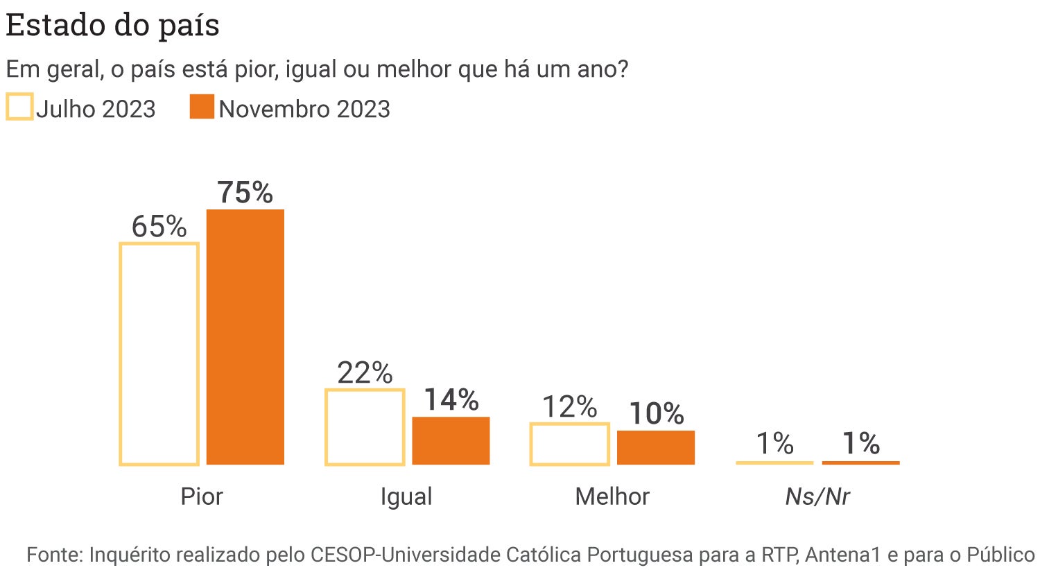 Na sondagem realizada em julho de 2023, 65 por cento dos inquiridos considerava que o país estava pior do que no ano anterior. Os dados do estudo feito entre 15 e 24 de novembro, já depois da demissão de António Costa do cargo de primeiro-ministro, mostram que o número passou para 75 por cento.
