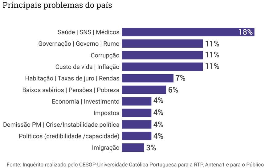 Em relação aos principais problemas do país, a questão da saúde é a que colhe mais críticas, com 18 por cento dos inquiridos a identificarem essa área como a mais problemática.