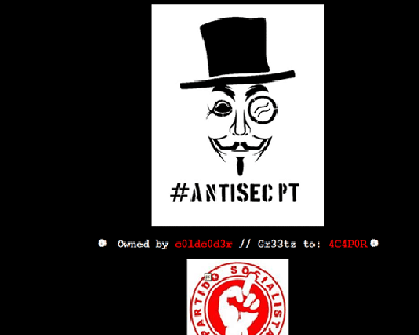 O site alterado pelos hackers mostra o símbolo dos piratas juntamente com uma imagem adulterada do emblema socialista.