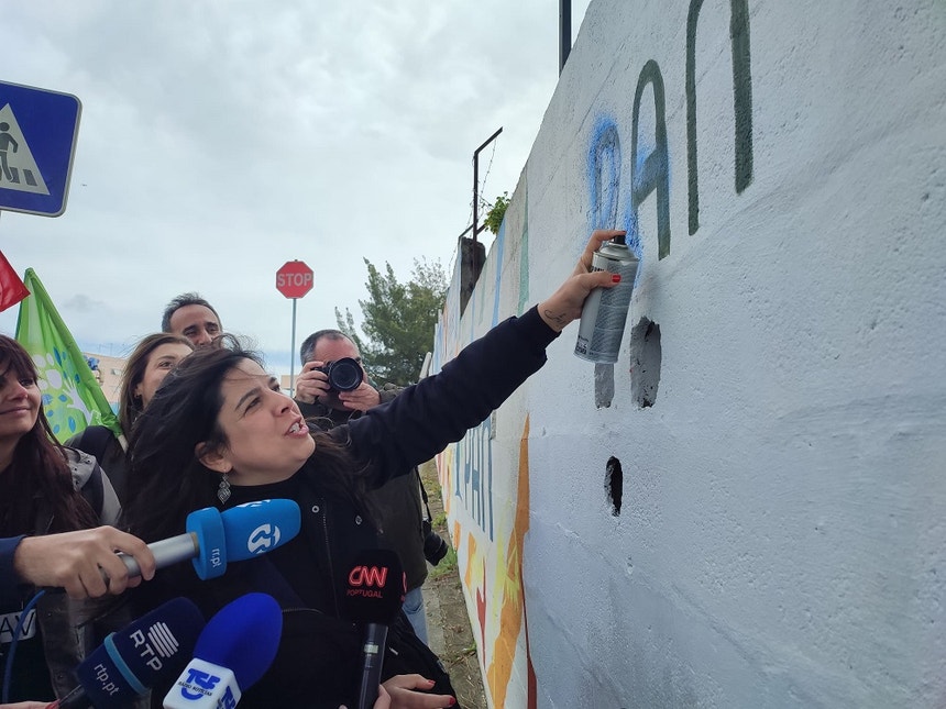 Inês Sousa Real esteve no mercado a falar com vendedores e pintou um mural que protesta contra o transporte de animais vivos.