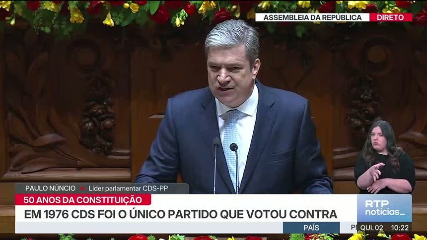 Paulo Núncio começou o discurso por recordar a posição contra a Constituição de 1976 dos deputados do CDS-PP há 50 anos: “fomos os primeiros (...) a afirmar naquele dia e sem medos que Portugal merecia muito mais e muito melhor do que o caminho por uma sociedade socialista”.
