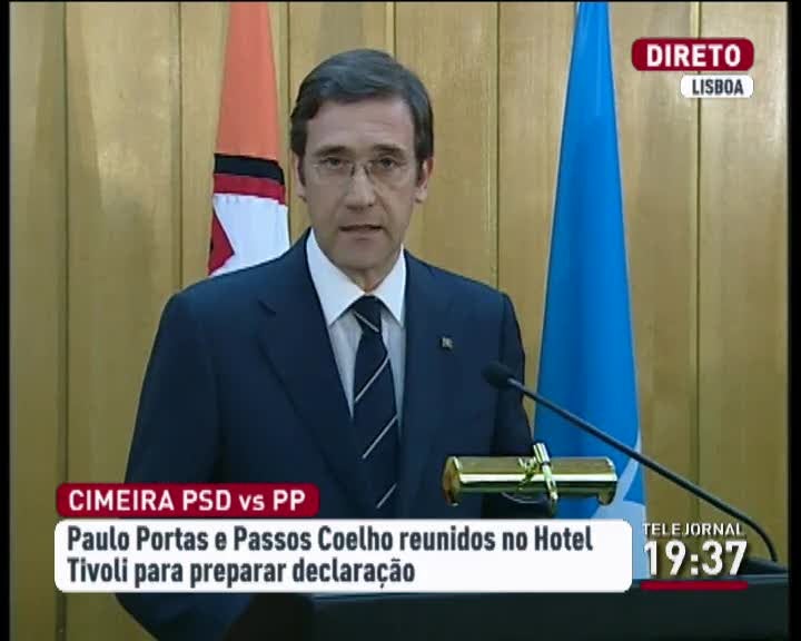 O primeiro-ministro Pedro Passos Coelho anunciou ter proposto ao Presidente da República que Paulo Portas assuma o cargo de vice-primeiro-ministro com a responsabilidade pela coordenação das políticas económicas e das negociações com a 'troika'. O primeiro-ministro defendeu que o acordo para assegurar a continuidade a coligação governamental PSD/CDS inclui a manutenção de Maria Luís Albuquerque como ministra de Estado e das Finanças e "alterações profundas na organização do Governo". A decisão foi anunciada por Passos Coelho, que leu uma declaração elaborada em conjunto com Paulo Portas, depois de as direções dos dois partidos terem estado reunidas num hotel de Lisboa.