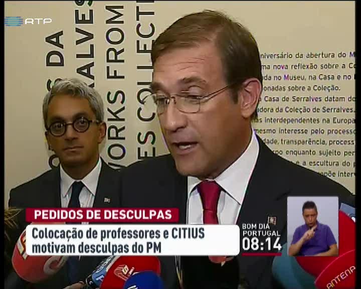O Primeiro-Ministro garante que os processos com responsabilidade penal e criminal não sofrem atrasos por causa dos problemas no acesso à plataforma Citius. Ontem no Porto, Passos Coelho assegurou também que o erro na fórmula de cálculo na colocação de professores está a ser corrigido e disse que essa falha afectou menos de 2 por cento dos docentes colocados.