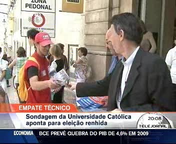 Universidade Católica (CESOP) para a Antena 1, a RTP, o Jornal de Notícias e o Diário de Notícias entre os dias 30 de Maio e 2 de Junho de 2009. O universo alvo é composto pelos indivíduos com 18 ou mais anos recenseados eleitoralmente e residentes em Portugal Continental. Foram seleccionadas aleatoriamente trinta e nove freguesias do país, tendo em conta a distribuição da população recenseada eleitoralmente por regiões NUT II (2001) e por freguesias com menos de 3200 recenseados, entre 3.200 e 11.000 e mais de 11.000 recenseados. A selecção aleatória das freguesias foi sistematicamente repetida até que os resultados eleitorais das eleições europeias de 2004 e legislativas de 2005 nessas freguesias estivessem a menos de 1% dos resultados nacionais dos cinco maiores partidos, ponderado o número de inquéritos a realizar em cada freguesia. Os domicílios em cada freguesia foram seleccionados por caminho aleatório e foi inquirido em cada domicílio o mais recente aniversariante recenseado eleitoralmente. As intenções de voto foram recolhidas através de simulação de voto em urna. Foram obtidos 3375 inquéritos válidos, sendo que 55% dos inquiridos eram do sexo feminino, 44% na região Norte, 12% no Centro, 32% em Lisboa e Vale do Tejo, 6% no Alentejo e 4% no Algarve. Todos os resultados obtidos foram depois ponderados de acordo com a distribuição da população com 18 ou mais anos residente no Continente por sexo (2007), escalões etários (2007) e qualificação académica (2001), na base dos dados do INE, e por região e habitat na base dos dados do recenseamento eleitoral. A taxa de cooperação foi de 83%. A margem de erro máximo associado a uma amostra aleatória de 3375 inquiridos é de 1,7%, com um nível de confiança de 95%.