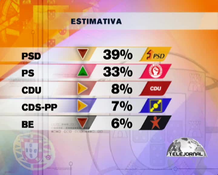 Se as eleições fossem hoje o PSD venceria com 39 por cento dos votos e o PS teria 33 por cento dos mesmos, assistindo-se a uma diminuição da vantagem dos social-democratas face aos socialistas. O PSD e o CDS-PP estariam perto da maioria absoluta, com 47 por cento dos votos, enquanto o PS sobe nas intenções de voto em comparação com dados recolhidos em outubro passado. Com a proximidade das eleições, aumenta a percentagem daqueles que tencionam ir votar.