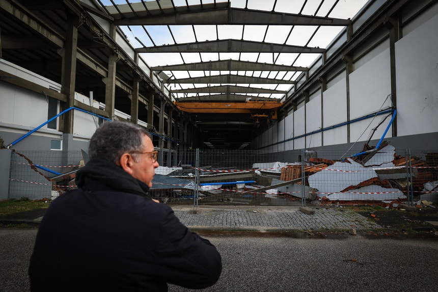 Até chegar ao Parque Empresarial de Proença-a-Nova, esta terça-feira, há árvores tombadas, árvores cortadas, sinais e placas de trânsito derrubados. E há uma empresa, entre tantas outras, esta, de cerâmica, praticamente destruída pelo mau tempo.