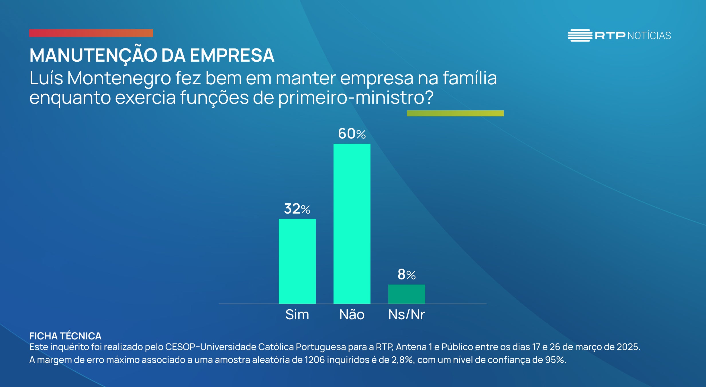 No mesmo sentido, 60% disseram que Luís Montenegro não fez bem em manter a empresa na família enquanto exercia as funções de primeiro-ministro, enquanto 32% defenderam que fez bem.