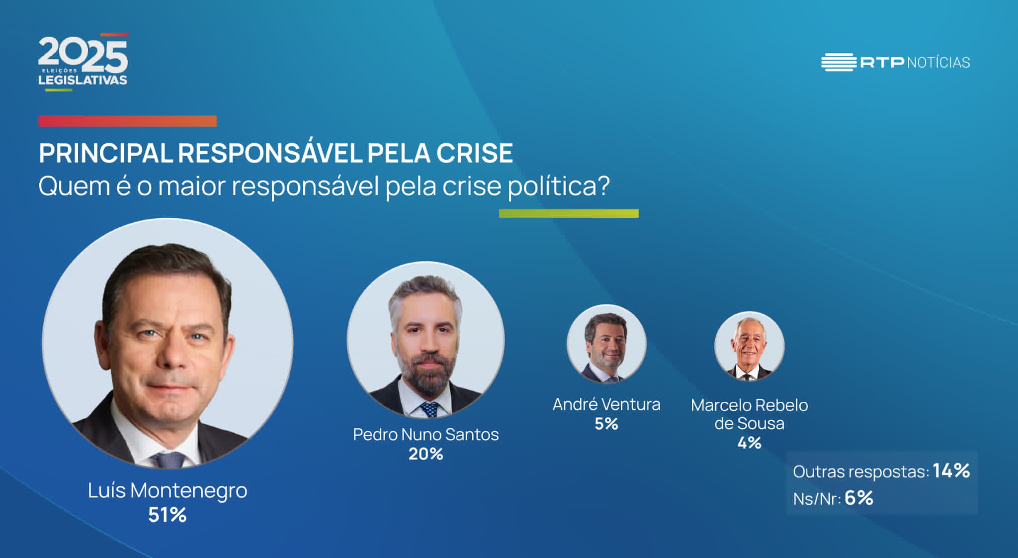 Mais de metade dos inquiridos na última sondagem do CESOP - Universidade Católica Portuguesa para a RTP, Antena 1 e Público consideram que o maior responsável pela atual crise política é o primeiro-ministro. A grande maioria acredita também que Luís Montenegro não deu todos os esclarecimentos necessários acerca da polémica em torno da sua empresa, a Spinumviva.