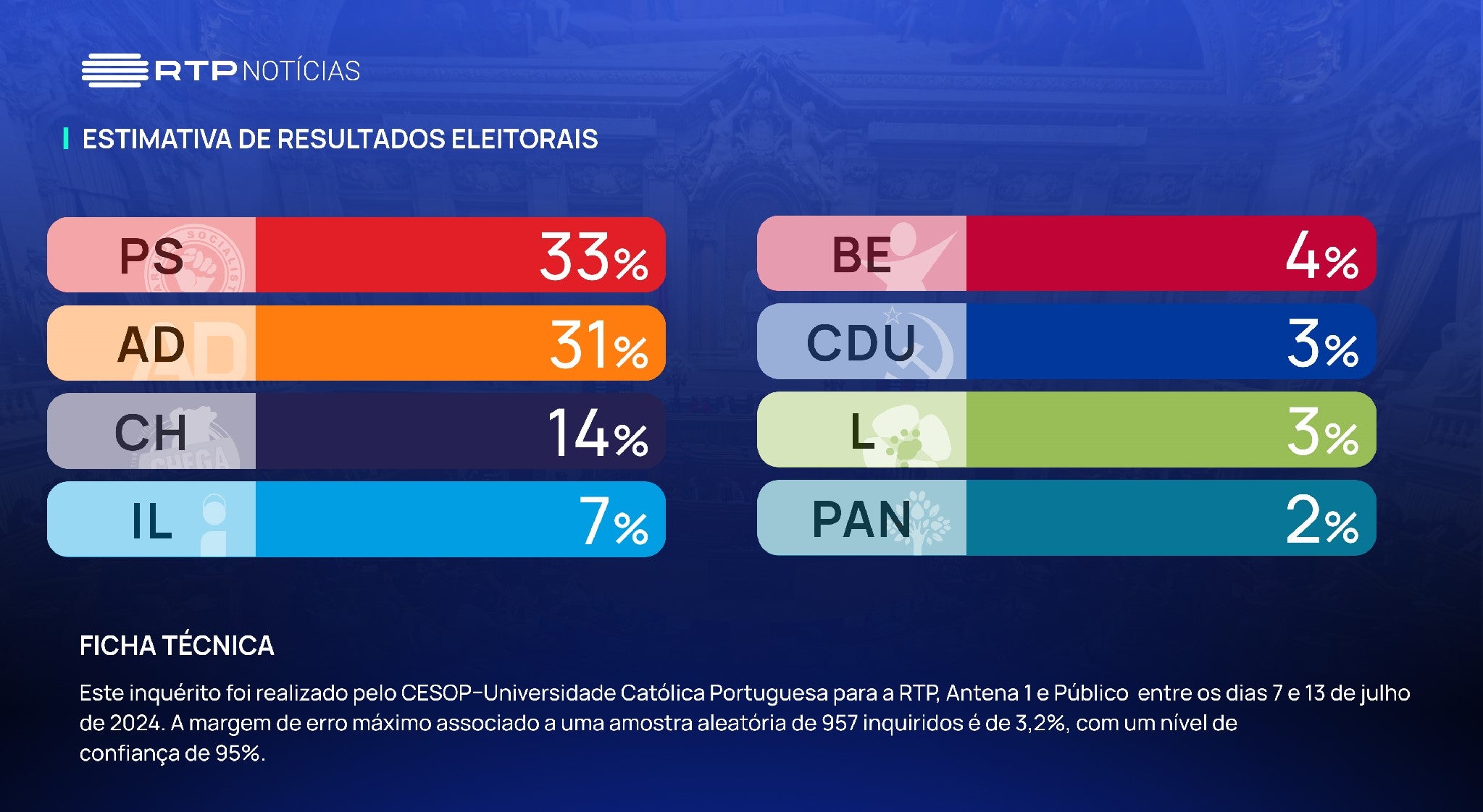 Este inquérito foi realizado pelo CESOP–Universidade Católica Portuguesa para a RTP, Antena 1 e Público entre os dias 7 e 13 de julho de 2024. O universo alvo é composto pelos eleitores residentes em Portugal. Os inquiridos foram selecionados aleatoriamente a partir duma lista de números de telemóvel, também ela gerada de forma aleatória. Todas as entrevistas foram efetuadas por telefone (CATI). Os inquiridos foram informados do objetivo do estudo e demonstraram vontade de participar. Foram obtidos 957 inquéritos válidos, sendo 48% dos inquiridos mulheres. Distribuição geográfica: 30% da região Norte, 20% do Centro, 36% da A.M. de Lisboa, 5% do Alentejo, 4% do Algarve, 2% da Madeira e 3% dos Açores. Todos os resultados obtidos foram depois ponderados de acordo com a distribuição da população por sexo, escalões etários, região e comportamento de voto com base nos dados do recenseamento eleitoral e das últimas eleições legislativas. A taxa de resposta foi de 21%*. A margem de erro máximo associado a uma amostra aleatória de 957 inquiridos é de 3,2%, com um nível de confiança de 95%.