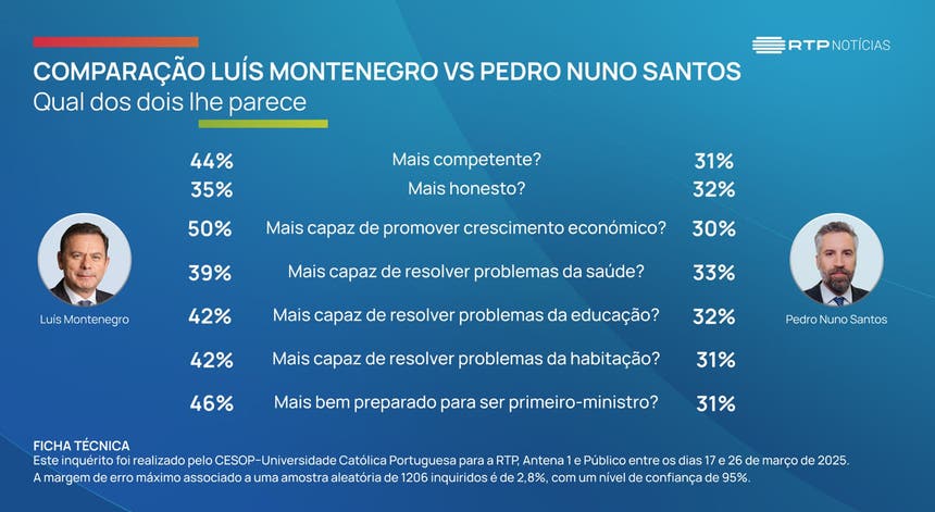 A maioria dos portugueses vê Luís Montenegro como mais competente e mais bem preparado para exercer o cargo de primeiro-ministro do que Pedro Nuno Santos. Os resultados da mais recente sondagem do CESOP - Universidade Católica Portuguesa para a RTP, Antena 1 e Público indicam também que a saúde é o tema mais importante para os eleitores nestas eleições legislativas.