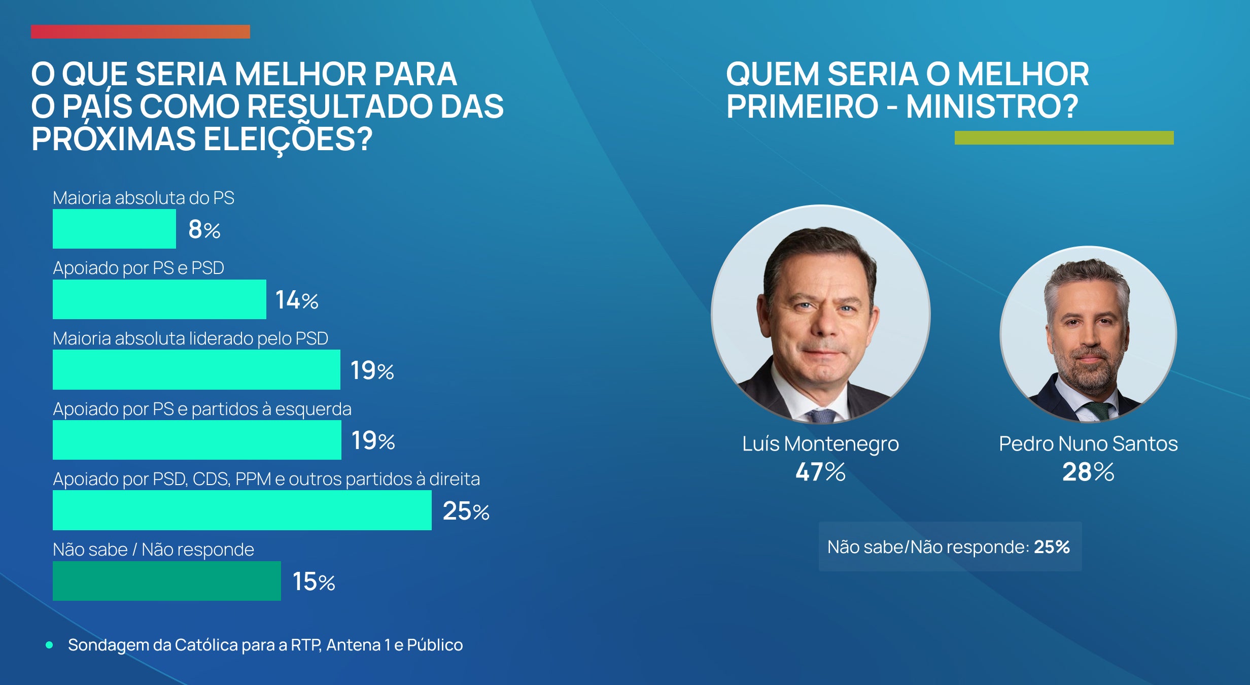 Os dados são semelhantes aos que foram recolhidos fevereiro de 2024, um mês antes das últimas eleições. Na altura, 46 por cento dos inquiridos considerava que o melhor primeiro-ministro seria Luís Montenegro, enquanto 34 por cento dava preferência a Pedro Nuno Santos. Vinte por cento dos inquiridos não respondiam a esta questão.