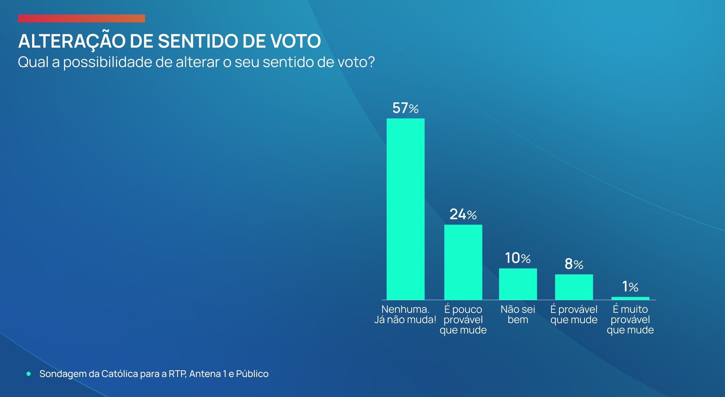A sondagem da Universidade Católica cruza ainda este dado dos inquiridos já decididos com a intenção de voto em cada partido. Conclui que os eleitores que responderam que o seu sentido de voto “já não muda” estão sobretudo entre os eleitores do Chega (77 por cento), PS (69 por cento), AD (64 por cento), CDU (61 por cento) e BE (59 por cento).