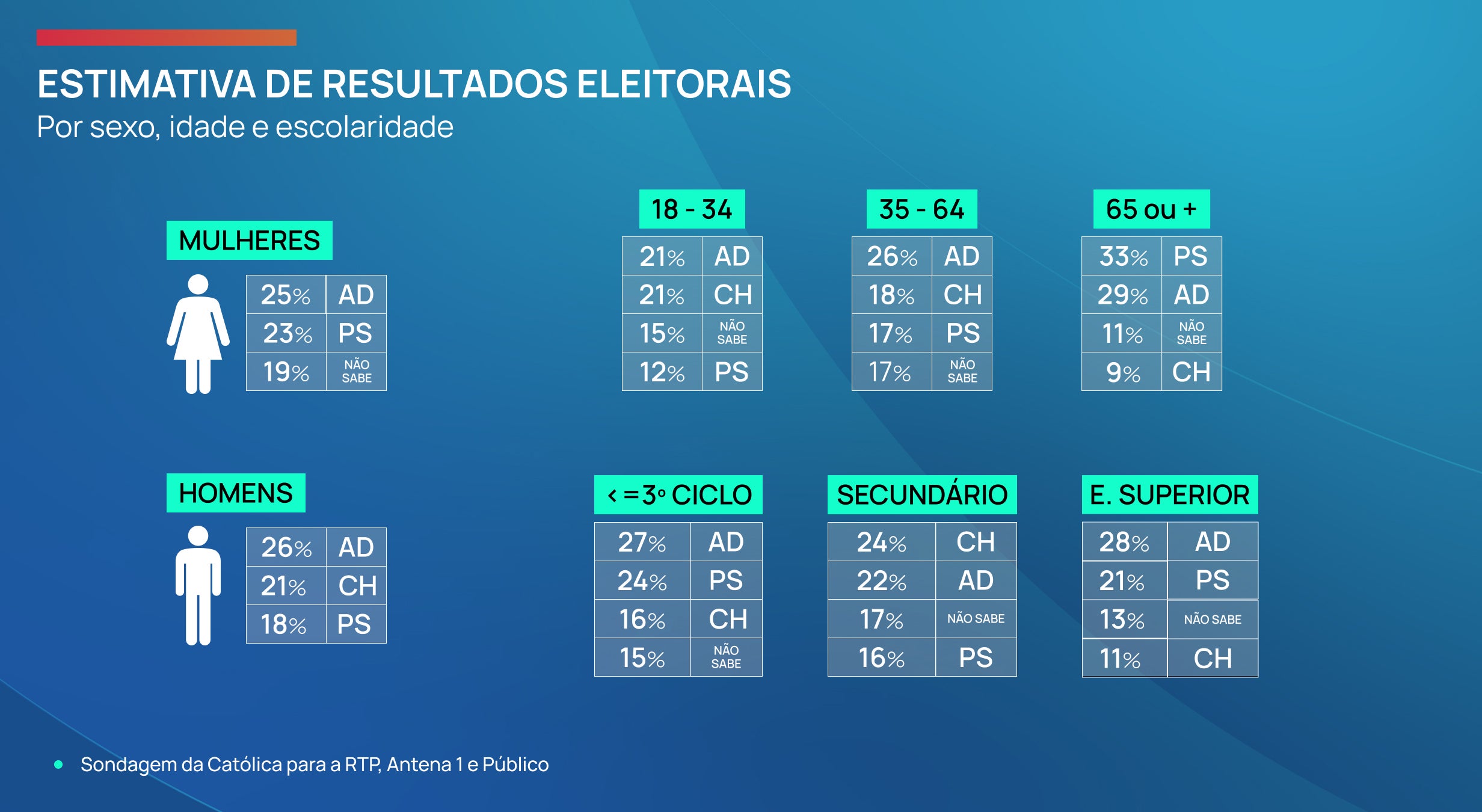 Na estimativa de resultados eleitorais por sexo, idade e escolaridade, mantêm-se algumas das tendências registadas no inquérito anterior. As mulheres continuam a dar preferência de voto à AD (25 por cento), seguindo-se o PS (19 por cento). Há ainda mais 19 por cento de votantes indecisas.