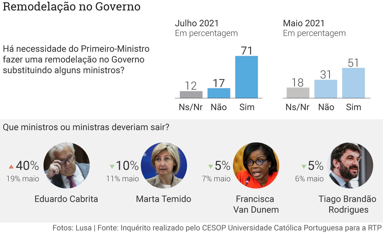 No total, 71 por cento dos inquiridos entende que o primeiro-ministro António Costa deve substituir alguns dos membros do executivo. Em maio, eram 51 por cento dos inquiridos a apontar para esta necessidade de fazer alterações no Governo.