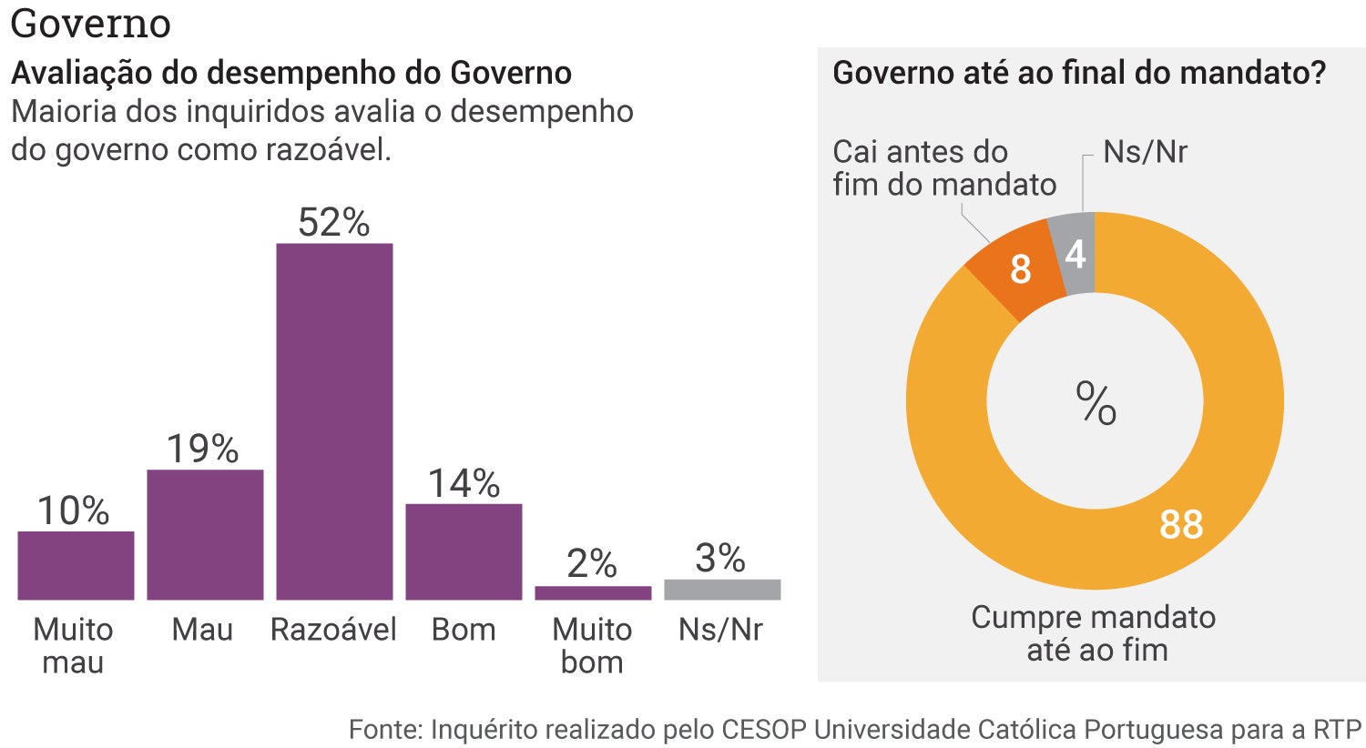 Apesar da aversão a alguns membros de Governo e da mais evidente exigência de remodelação, a esmagadora maioria dos portugueses (88 por cento) considera, ainda assim, que o executivo irá cumprir o mandato até ao fim. Apenas oito por cento dos inquiridos acreditam que o Governo irá cair antes do fim da legislatura.