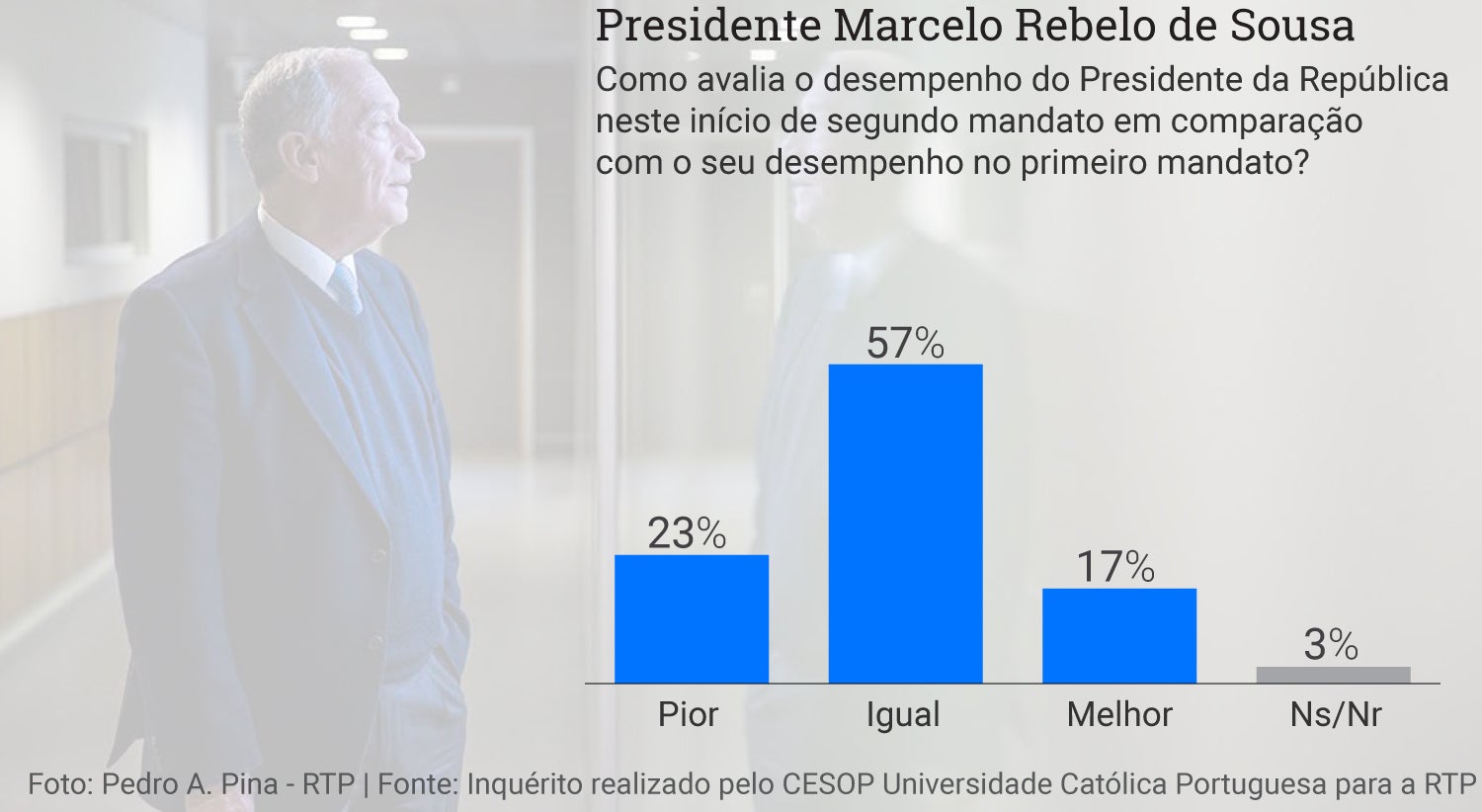 Finalmente, em relação ao presidente da República, a maioria dos portugueses considera que o desempenho de Marcelo Rebelo de Sousa “está igual” (57 por cento) em relação ao primeiro mandato. Há ainda 23 por cento dos inquiridos que respondem que a atuação do PR “está pior agora”, neste início de segundo mandato e outros 17 por cento respondem que “está melhor”, atualmente.