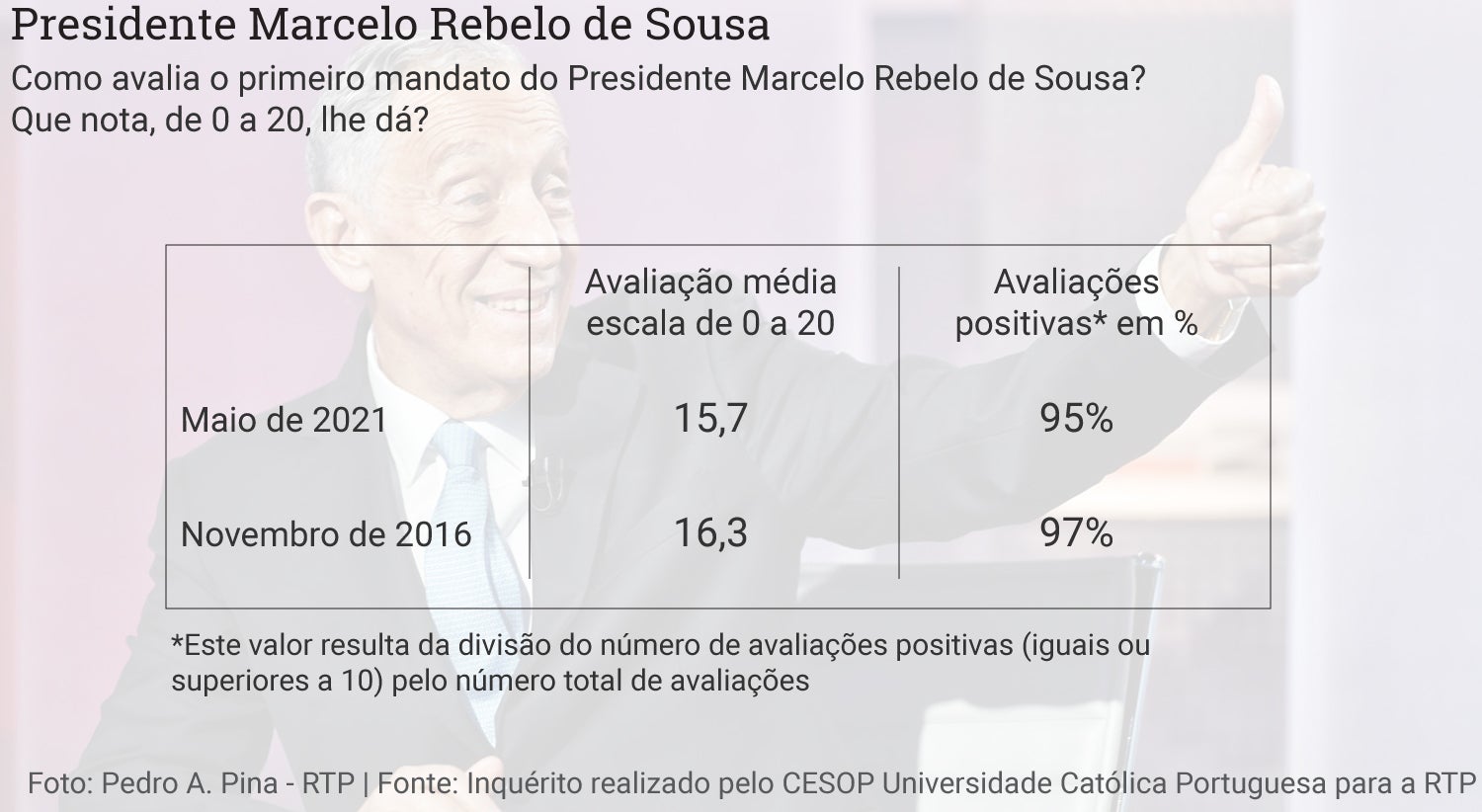 Numa avaliação de mais longo prazo, a Universidade Católica recorda os dados recolhidos em novembro de 2016, quando tinham passado alguns meses desde o início do primeiro mandato de Marcelo Rebelo de Sousa, e conclui que o presidente da República “mantém os elevadíssimos níveis de popularidade e reconhecimento” neste arranque do segundo mandato, tendo por base os dados de maio de 2021.