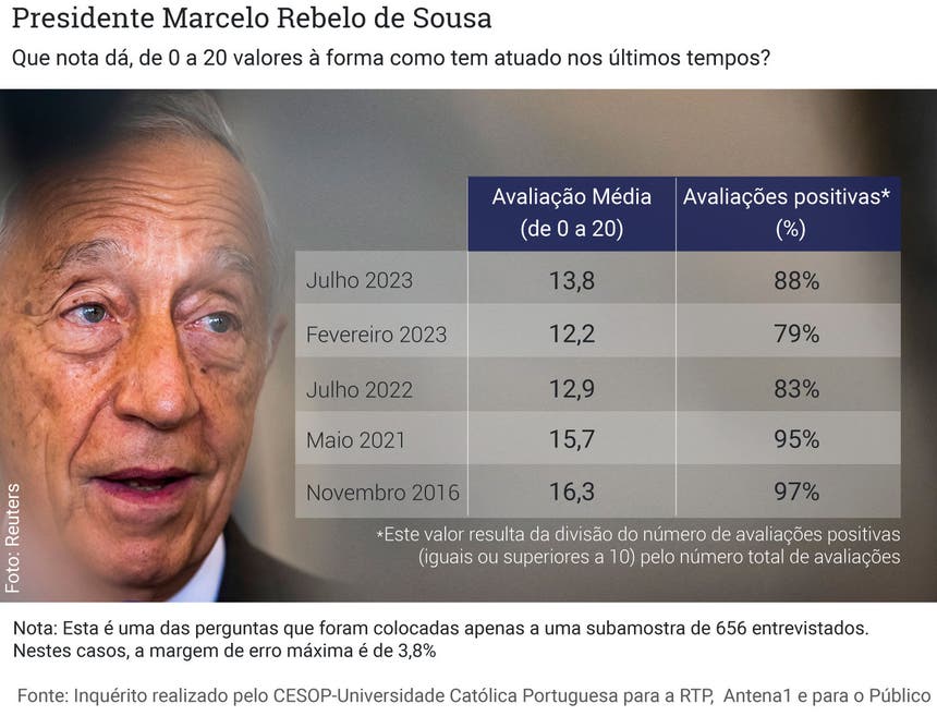 Uma subamostra de 656 entrevistados foi também chamada a avaliar o desempenho do chefe de Estado “nos últimos tempos”. Marcelo obtém este mês uma classificação média de 13,8, numa escala de zero a 20, com 88 por cento dos inquiridos a atribuírem-lhe avaliação positiva.Em fevereiro, a avaliação média do presidente era de 13,8 e a percentagem de avaliações positivas de 79 por cento.