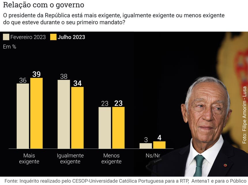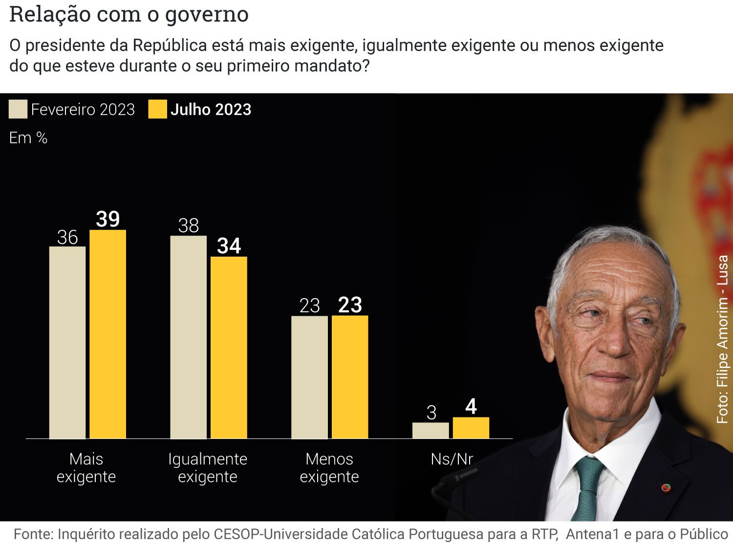 Outros 34 por cento veem Marcelo Rebelo de Sousa igualmente exigente e 23 por cento entendem que está agora menos exigente. Quatro por cento não sabem ou não respondem.Em fevereiro deste ano, 36 por cento dos inquiridos pelo CESOP viam Marcelo mais exigente para com o Executivo. Trinta e oito por cento consideravam-no igualmente exigente e dois por cento menos exigente.