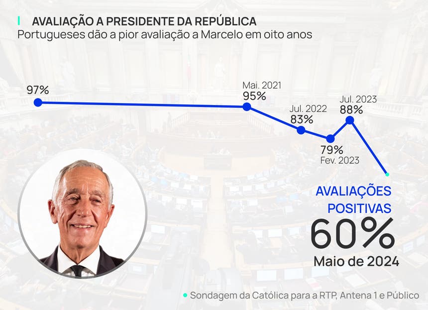 Esta é a pior avaliação de Marcelo Rebelo de Sousa em oito anos. Numa sondagem realizada em novembro de 2016, ainda no primeiro ano do seu primeiro mandato, o presidente da República foi avaliado positivamente por 97% dos inquiridos, tendo recebido uma avaliação média de 16,3 – a mais elevada das sondagens da Católica desde que há registos.
