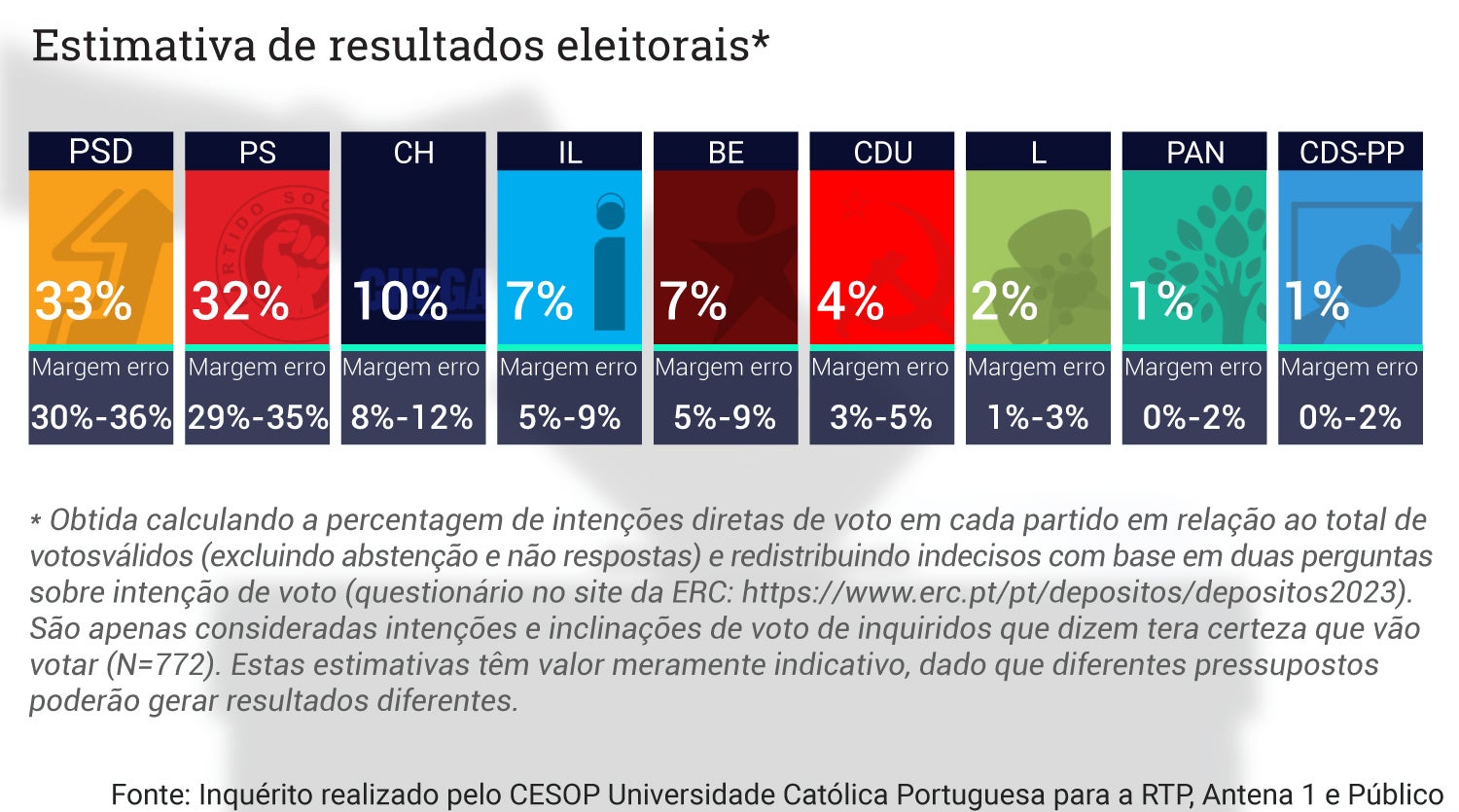 Este inquérito foi realizado pelo CESOP – Universidade Católica Portuguesa para a RTP, Antena1 e Público entre os dias 6 e 15 de julho de 2023. O universo alvo é composto pelos eleitores residentes em Portugal. Os inquiridos foram selecionados aleatoriamente a partir duma lista de números de telemóvel, também ela gerada de forma aleatória. Todas as entrevistas foram efetuadas por telefone (CATI). Os inquiridos foram informados do objetivo do estudo e demonstraram vontade de participar. Foram obtidos 1006 inquéritos válidos, sendo 45% dos inquiridos mulheres. Distribuição geográfica: 32% da região Norte, 20% do Centro, 34% da A.M. de Lisboa, 7% do Alentejo, 4% do Algarve, 2% da Madeira e 2% dos Açores. Todos os resultados obtidos foram depois ponderados de acordo com a distribuição da população por sexo, escalões etários e região com base no recenseamento eleitoral. A taxa de resposta foi de 29%. A margem de erro máximo associado a uma amostra aleatória de 1006 inquiridos é de 3,1%, com um nível de confiança de 95% (Algumas perguntas foram colocadas apenas a uma subamostra de 656 entrevistados. Nestes casos, a margem de erro máxima é de 3,8%).