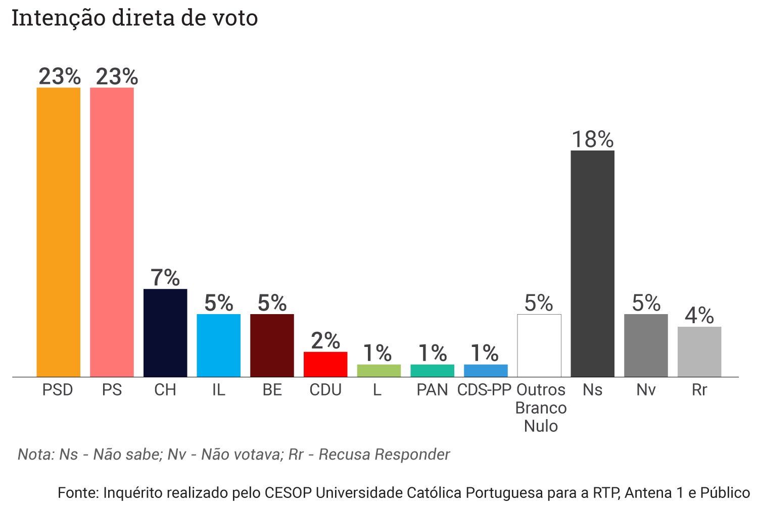O PS e o PSD estão lado a lado num empate técnico no que respeita às intenções de voto dos portugueses, com ligeira vantagem para os social-democratas (33% para 32%), de acordo com uma sondagem da Universidade Católica para a RTP, Antena 1 e jornal Público. Em ligeira queda estão o Chega e a IL, quando os números de agora são comparados com uma sondagem de há meio ano.