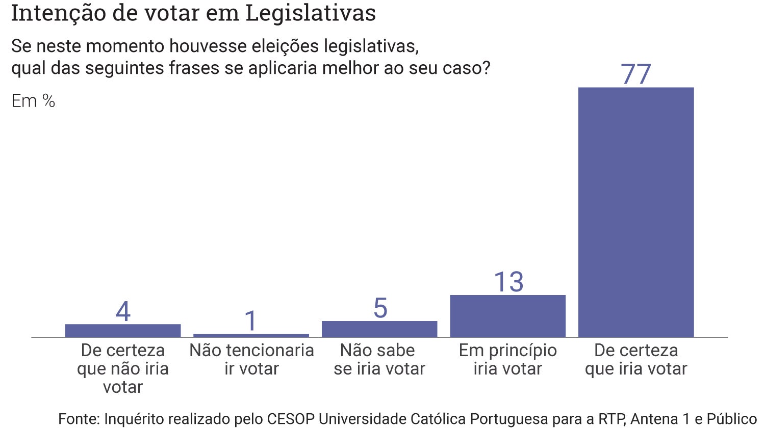 À questão sobre a intenção de exercer o direito de voto caso houvesse agora eleições, 77% dos inquiridos respondeu que “de certeza que iria votar” contra os apenas 4% que “de certeza não iriam votar”.