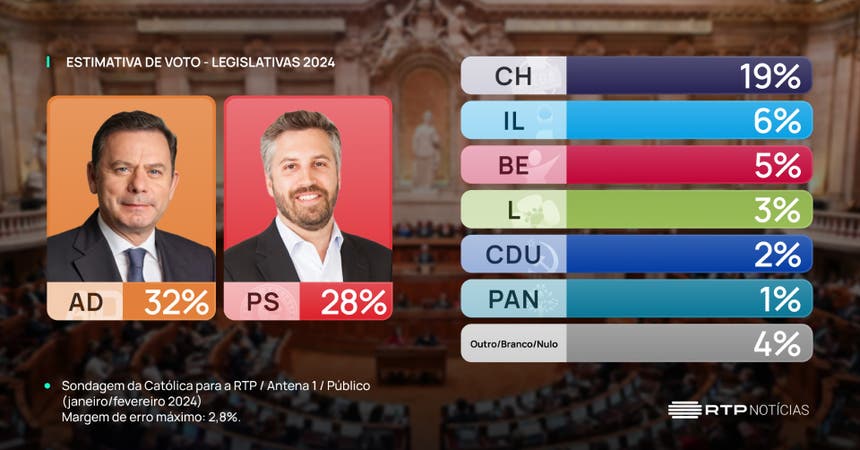 Se as eleições legislativas se realizassem agora, a vitória iria para a Aliança Democrática liderada por Luís Montenegro, com 32% dos votos, quatro pontos à frente do PS, segundo a sondagem da Universidade Católica para a RTP, Antena 1 e Público desta segunda-feira. As intenções diretas de voto revelam, porém, uma percentagem muito elevada de indecisos (20%).