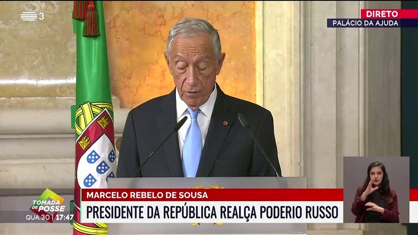 Marcelo Rebelo de Sousa frisa que “é neste parcialmente outro mundo, desde já a buscar a paz, que começamos um novo ciclo em que o mandato do Governo empossado vai praticamente coincidir com o mandato dos autarcas eleitos em outubro e o meu mandato, que termina daqui a muito pouco, daqui a menos de quatro anos”.