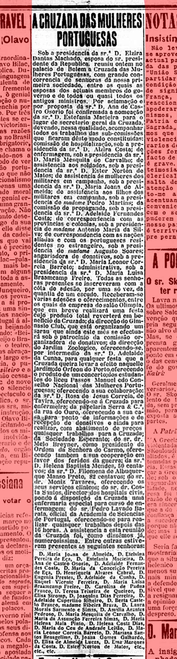 Presidida por Elzira Dantas Machado, mulher do presidente Bernardino Machado, contando também com suas filhas e outras familiares de políticos e militares notáveis, a Cruzada aglutinou quase uma centena de mulheres da elite republicana.