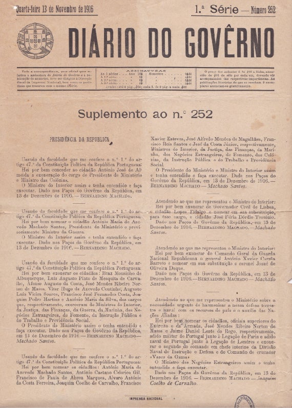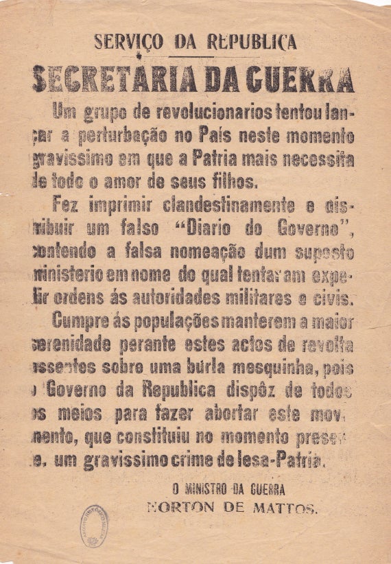 Machado Santos falsifica um Diário do Governo supostamente assinado pelo Presidente da República Bernardino Machado que lhe entrega o governo – neste documento tem o cuidado de nomear o Ministro de Guerra Norton de Matos para adido militar para Paris.