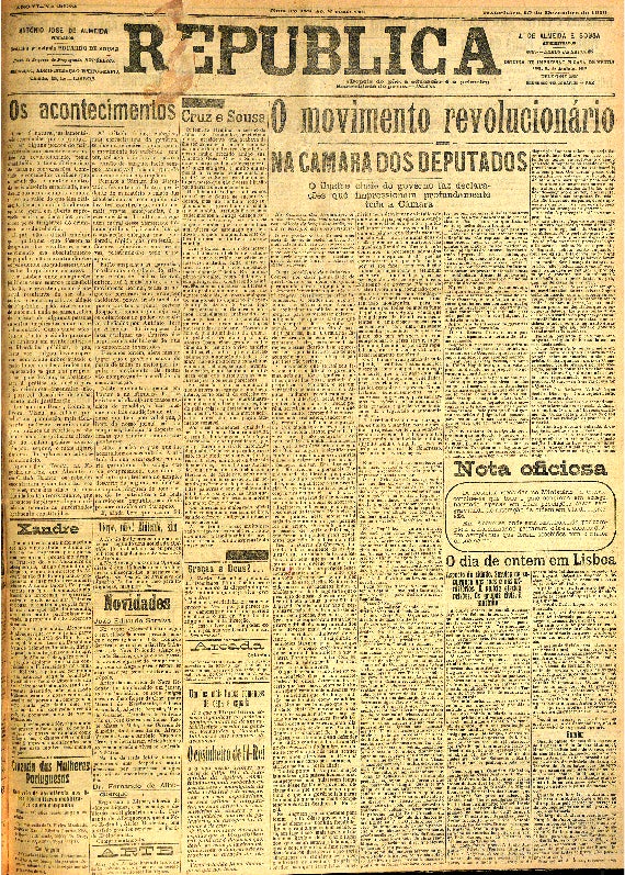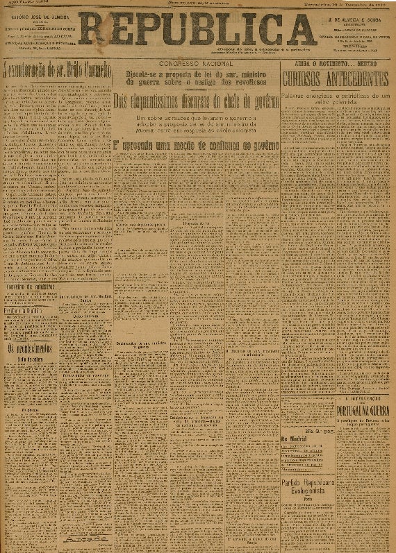 Brito Camacho confronta o presidente do governo exigindo que se esclareça se Machado Santos, herói do 5 de Outubro, queria afinal derrubar o governo ou se era acusado de querer derrubar a República. Protestando que sem ele Machado Santos não haveria sequer República. Segue-se sessão animada, com grandes protestos e barulheira geral …