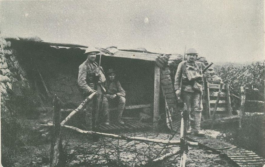 Andaram perdidos toda a noite, alguns já, caíam para o lado, com as mochilas muito pesadas, e portanto chegaram a Neuve Chapelle e ele foi incorporado nesse. Na noite seguinte foi para a primeira linha. E sofreram um dos grandes bombardeamentos. Aí é que de facto tomou o primeiro contacto com a realidade da guerra.