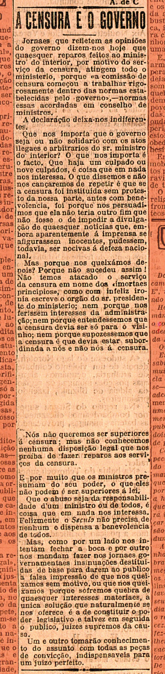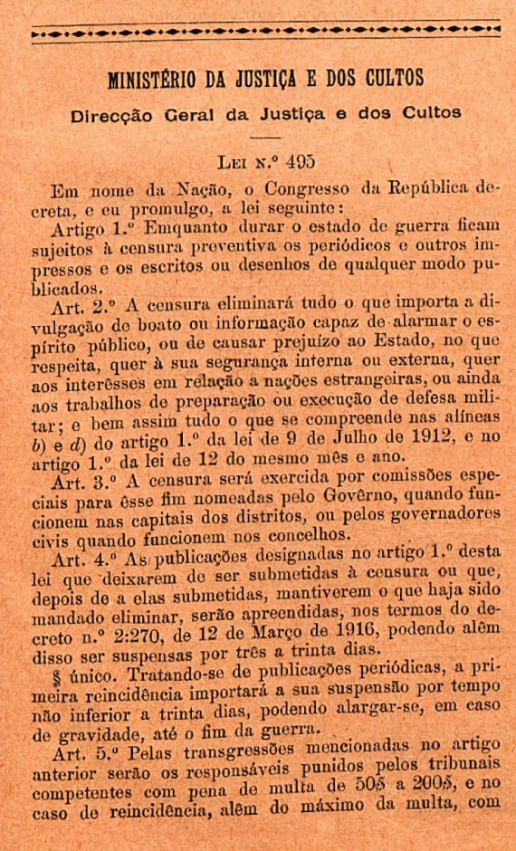 A primeira restrição surge a 30 de Novembro de 1914, num decreto que proíbe a publicação de notícias relativas ao movimento das forças militares portuguesas: