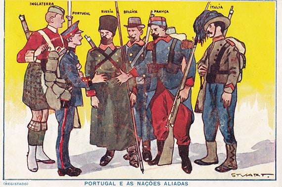 E o postal, tal instagram ou correio eletrónico da época, torna-se veículo de propaganda patriótica. Colorido com fio de seda ou ilustrado, o pequeno formato torna-se pop, espalha ideias e imagens, propaga-se, multiplica o discurso, cresce – durante a Grande Guerra circulam mais de 70 milhões de exemplares por ano. Exaltam-se os países aliados, as velhas alianças. Erguem-se e desfraldam-se bandeiras.