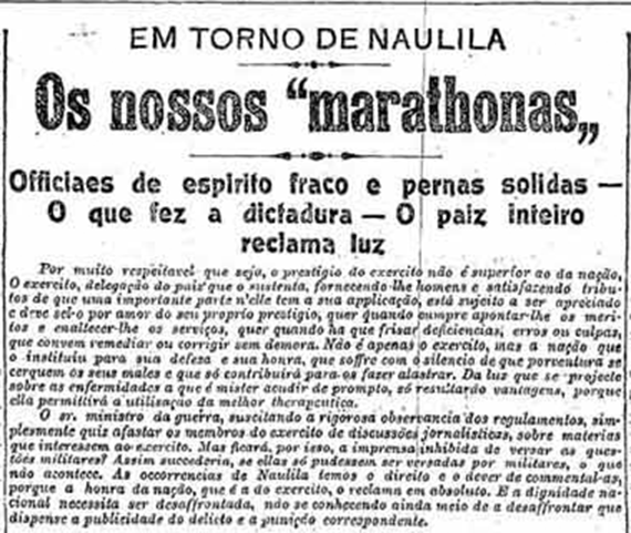 Alegadas ordens de Alves Roçadas referidas noutros artigos sobre Naulila foram ainda motivo de diversas cartas do tenente Marques. Vários artigos denegriam ainda a ação de vários soldados e oficiais, apelidados de “marathonistas” pela velocidade com que alegadamente haviam fugido dos combates.