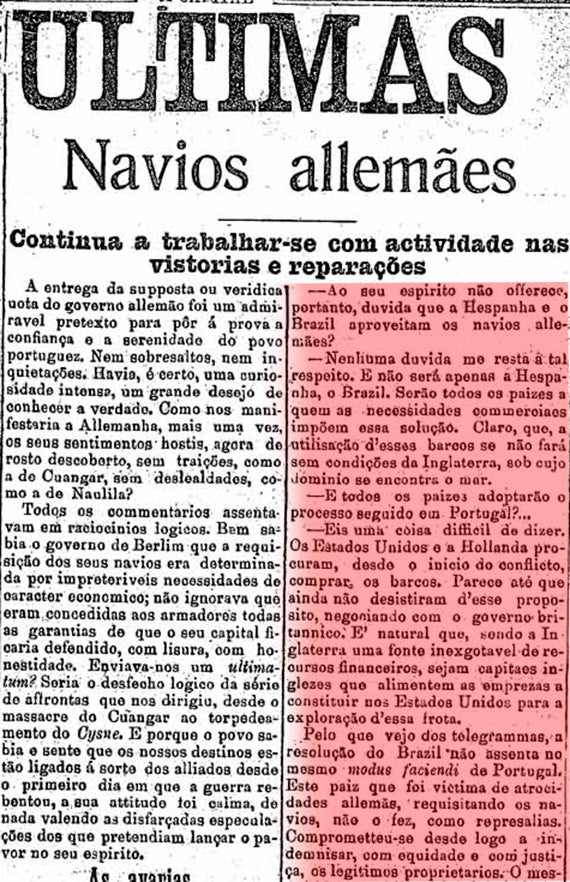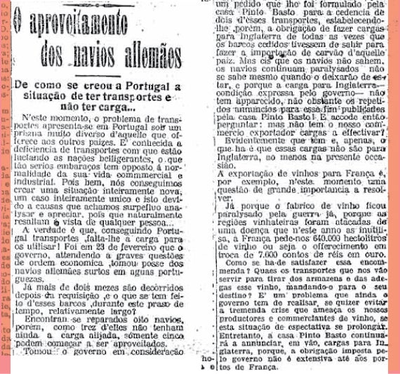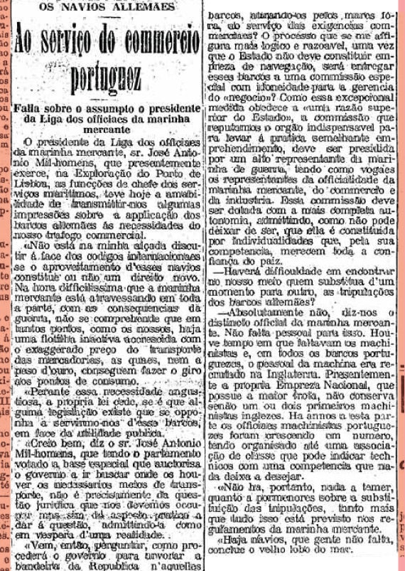 “Não está na minha alçada discutir à face dos códigos internacionais se o aproveitamento d’esses navios constitui ou não um direito novo. Na hora dificílima que a marinha mercante está atravessando em toda a parte, com as consequências da guerra, não se compreende que em tantos portos, como os nossos, haja uma flotilha inativa acrescida com o exagerado preço do transporte das mercadorias, as quais nem a peso de ouro conseguem fazer o giro dos pontos de consumo” referiu em entrevista à Capital, dia 7 de fevereiro.