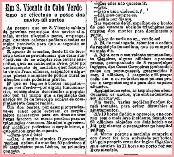 Nos dias seguintes chegaram as notícias de que nos outros portos portugueses tinham sido apreendidos os navios alemães ali estacionados, sem quaisquer problemas por parte dos alemães. Em Cabo Verde o aparato foi considerável.